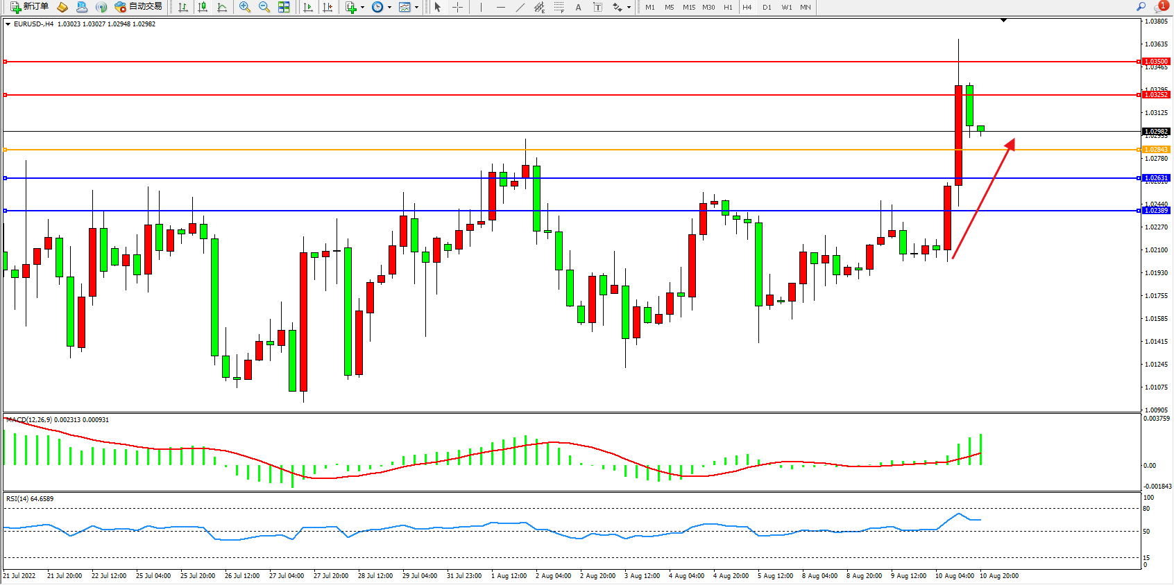 欧元美元EURUSD—4小时K线图显示: