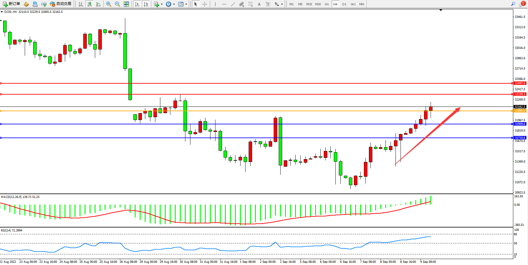 道琼斯指数9月9日(周五)收盘上涨377.19点,涨幅1.19%,报32151.71点;美联储布拉德表示更强烈倾向于加息75个基点,前置加息越快越好。