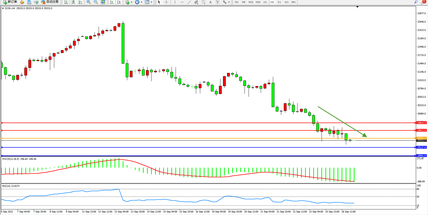 道琼斯指数9月26日(周一)收盘下跌329.60点,跌幅1.11%,报29260.81点;由于美国经济前景相对乐观,美元较其他货币优势也不断强化。尽管存在全局性担忧,美联储主席鲍威尔此前表示,美联储将继续关注通胀,并且需要看到“未来几个月”物价上涨速度令人信服地下降,才会改变货币政策前景。