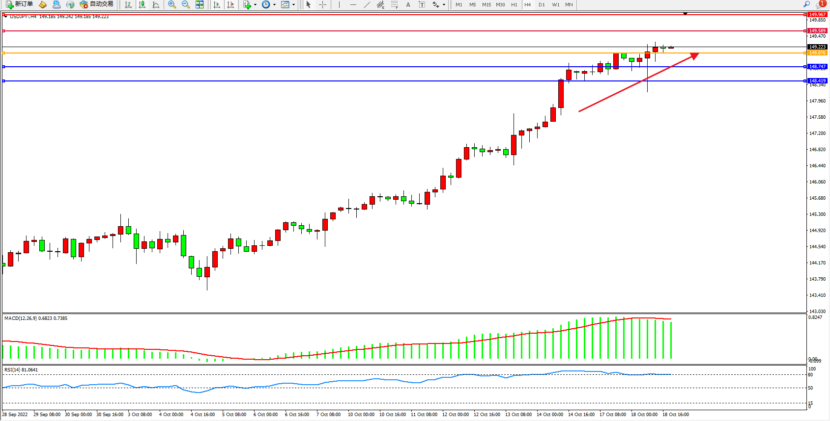 交易策略:149.076上方看涨,目标149.589、149.967