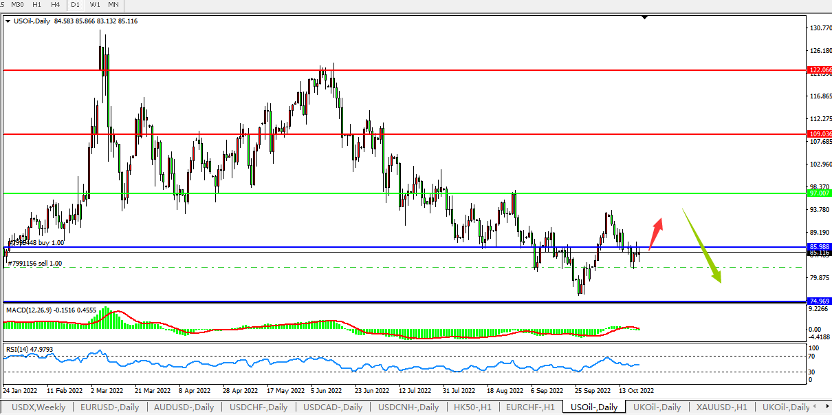 日线图看:油价再度触底后小幅反弹, MACD量能柱0轴上方开始缩量,RSI指标走势平缓,短期油价延续反弹上攻概率较大。