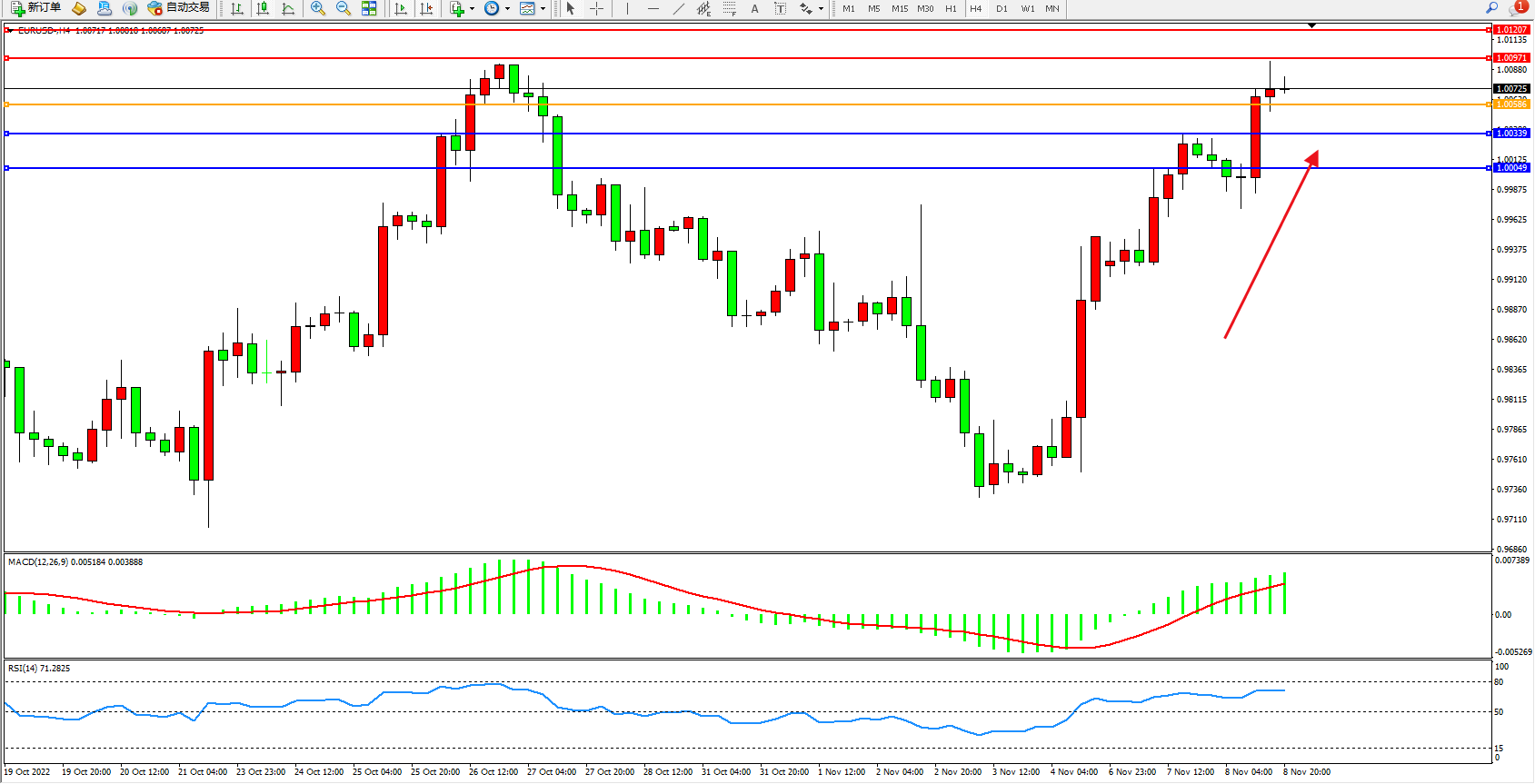 欧元美元EURUSD—4小时K线图显示: