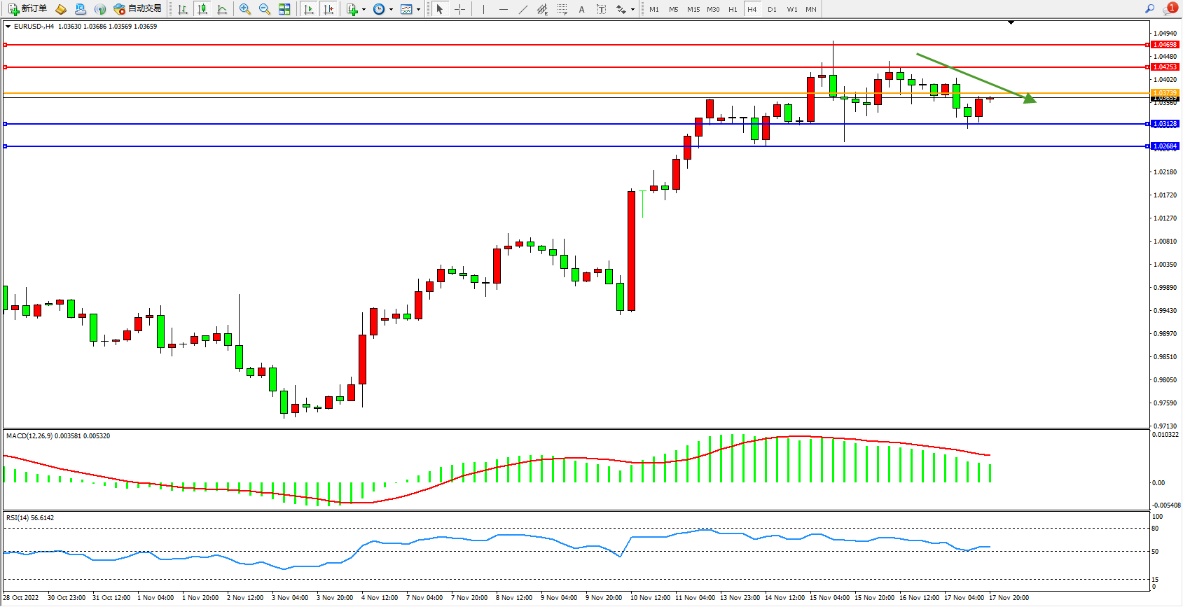 欧元美元EURUSD—4小时K线图显示: