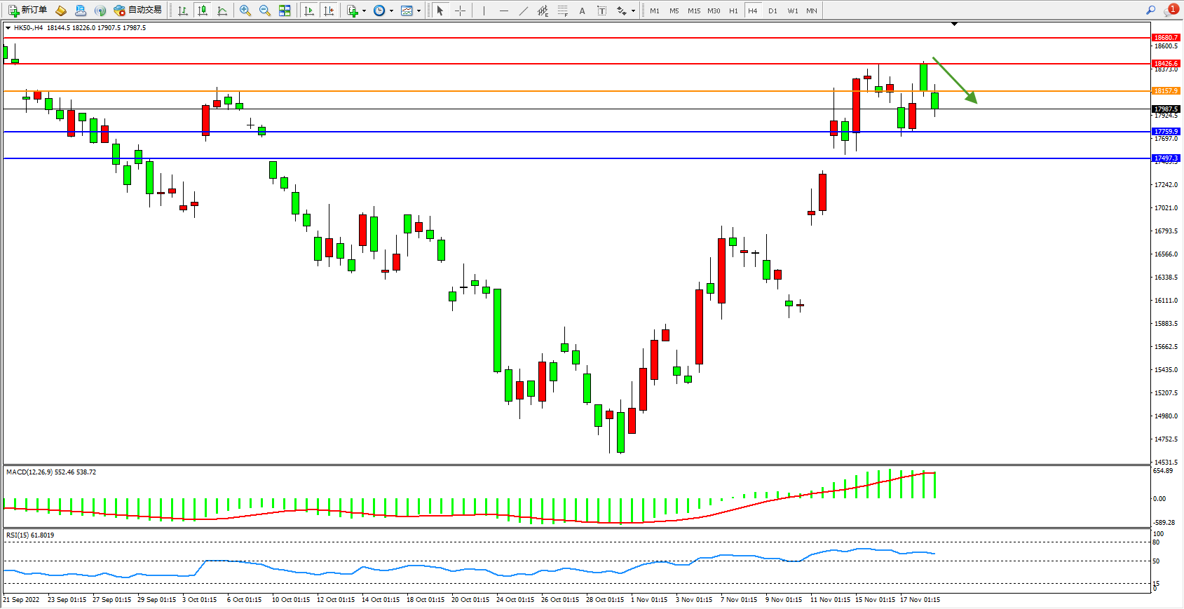 香港恒生指数11月18日(周五)收盘下跌53.12点,跌幅0.29%,报17992.54点;股早盘冲高后呈现持续回调行情,午后三大指数皆由涨转跌,恒指最终收跌0.29%,失守18000点大关,国指跌0.25%,恒生科技指数涨0.57%,盘中最高涨幅高达4.4%。早盘大涨的科技股涨幅均收窄,美团涨近5%,盘中一度涨超9%,网易、京东、阿里巴巴保持上涨行情,惟腾讯转跌至1.44%;政策利好袭来,教育股全天大涨,南下资金全日净流入0.49亿港元,大市成交额为1395亿港元。