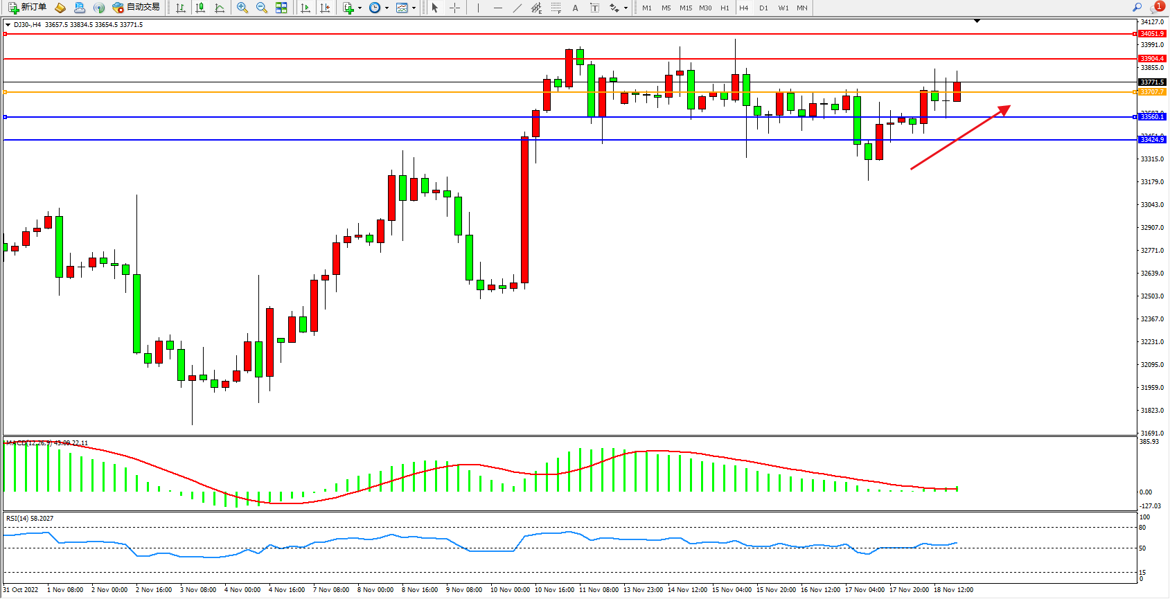 4小时图看:高位多头动力再度震荡上移,市场看涨情绪涌现,前期高位近在咫尺,破位在即,MACD指标处于0轴线附近弱势整理,RSI指标处于50均衡线上側徘徊;