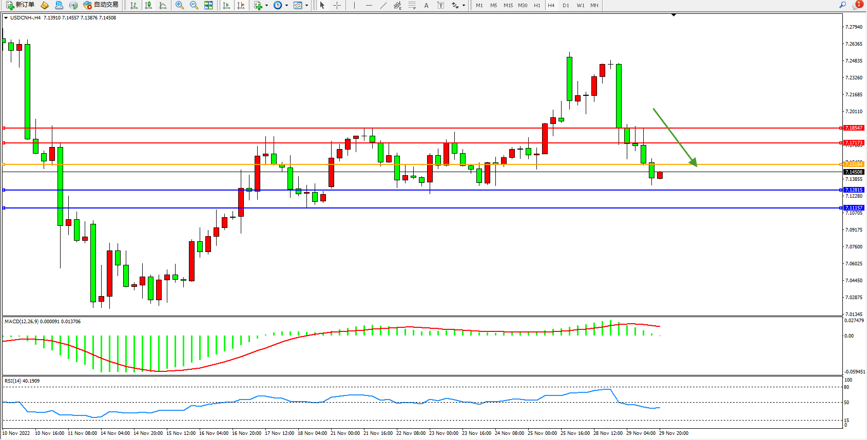 交易策略:7.15184下方看跌,目标7.12815、7.11157