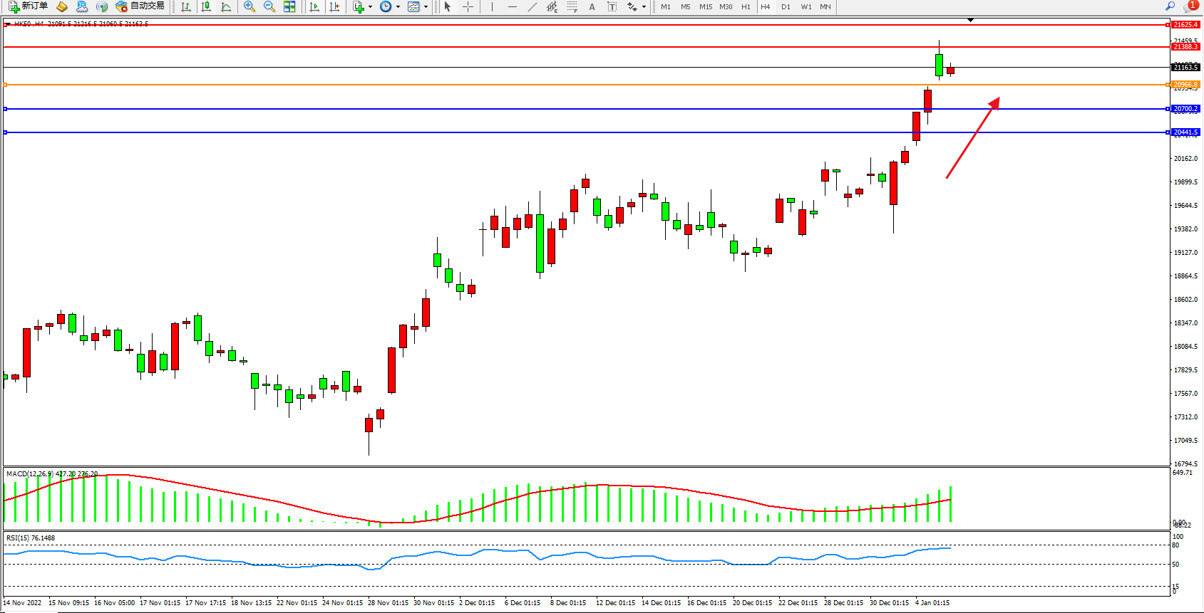 香港恒生指数1月5日(周四)收盘上涨259.06点,涨幅1.25%,报21052.17点;港股2023年开年后连续上涨,恒指连破两大关口,重回21000点上方,3日连涨达6.42%。恒指涨1.25%,国指涨1.51%,恒生科技指数涨1.51%,三者盘中皆刷新阶段新高。香港公布与内地通关首阶段安排。为确保市民安全、有序及顺畅地“通关”,香港与内地首阶段“通关”所涉及的陆路口岸将设人数限制。南下资金净流入53.61亿港元,大市成交额为1741亿港元。