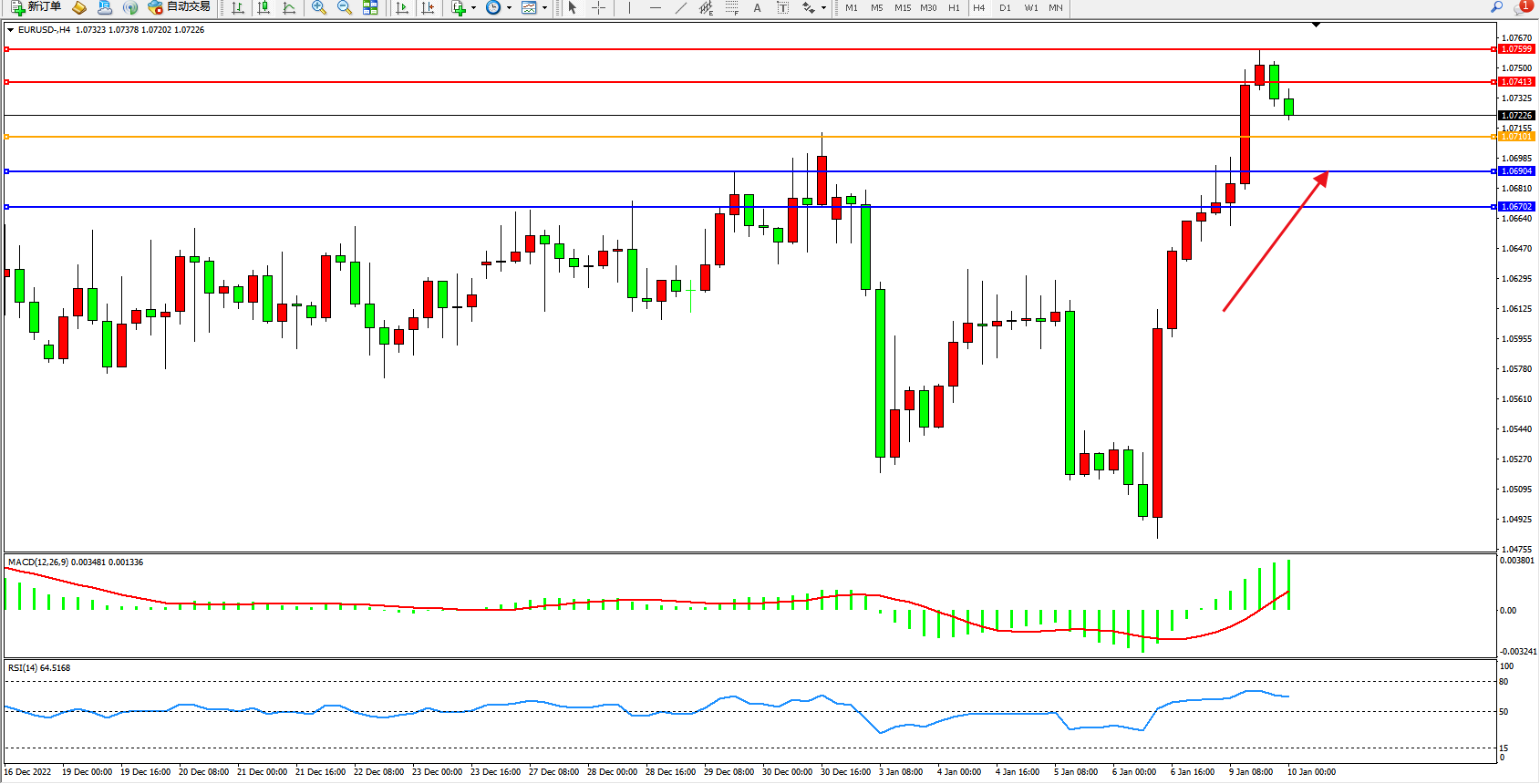 4小时图看:多头动力强势拉升后,高位短期震荡,市场多头高位出现回撤,但整体看涨情绪依旧,MACD指标处于多头区域持续上移,RSI现在不处于多头区域震荡;