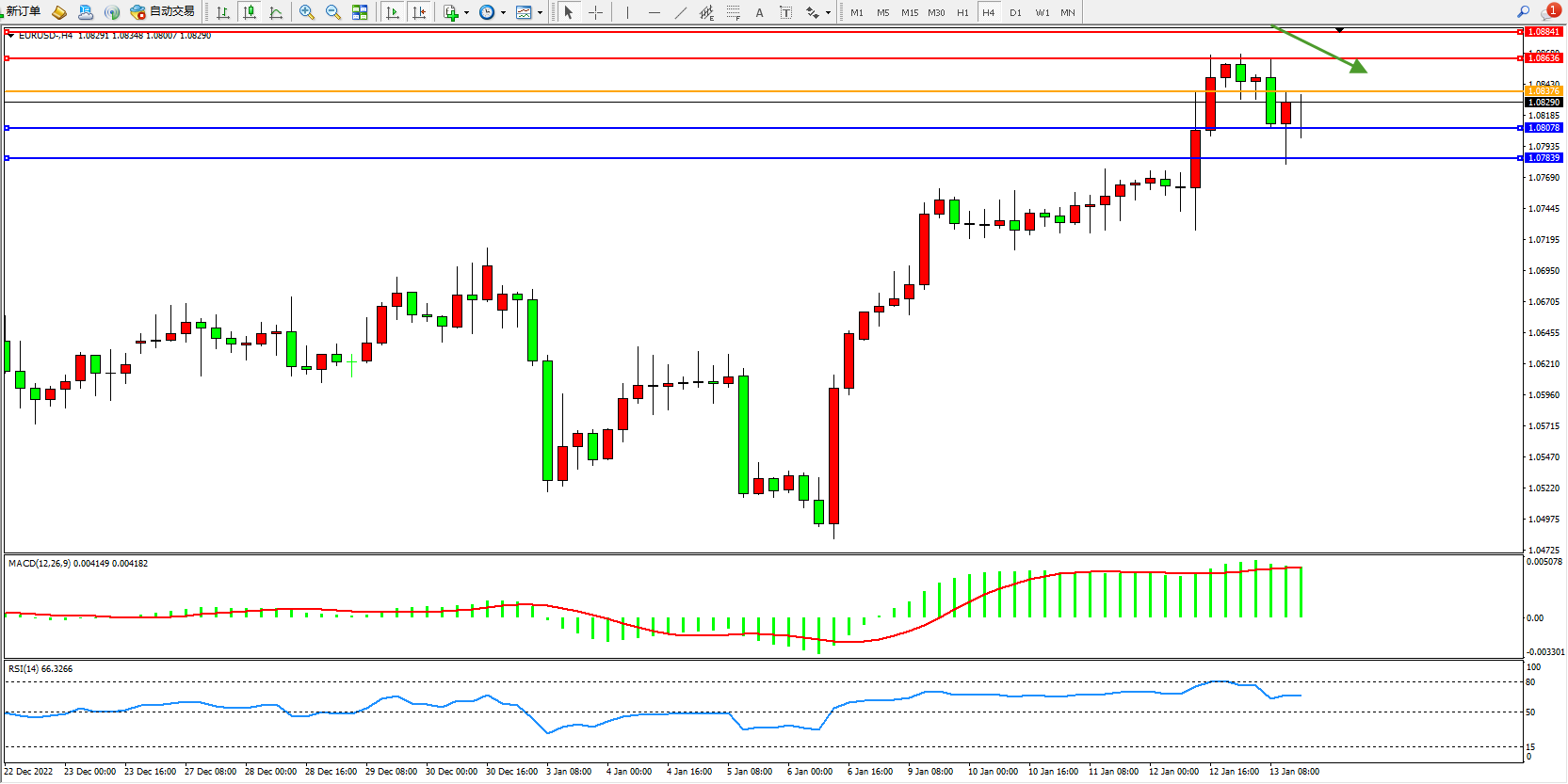 4小时图看:高位短期震荡,空头动力有伺机入场下行迹象,MACD指标处于多头区域高位徘徊,RSI指标处于多头区域整理;
