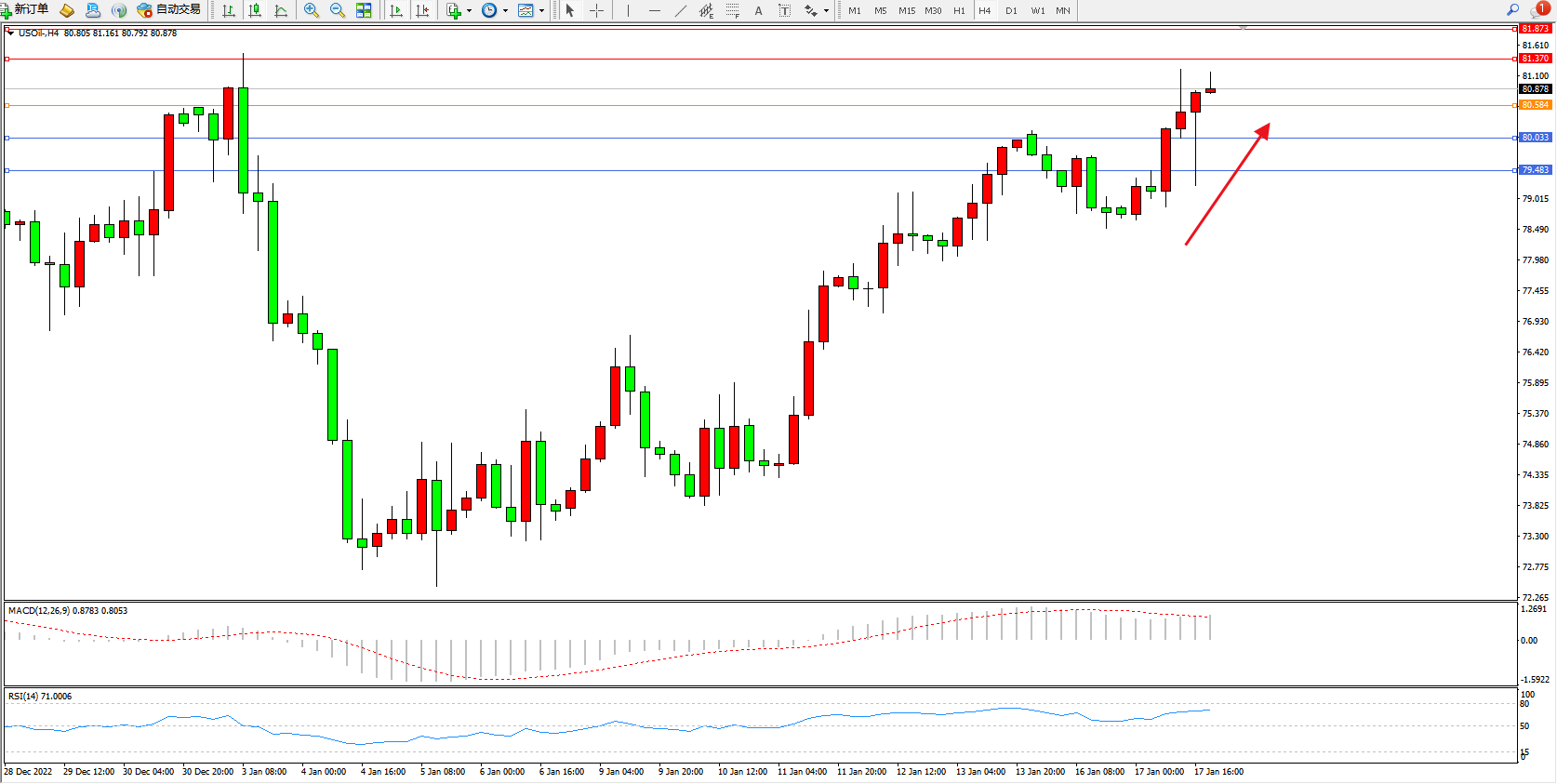 原油USOil——4小时K线图显示:
