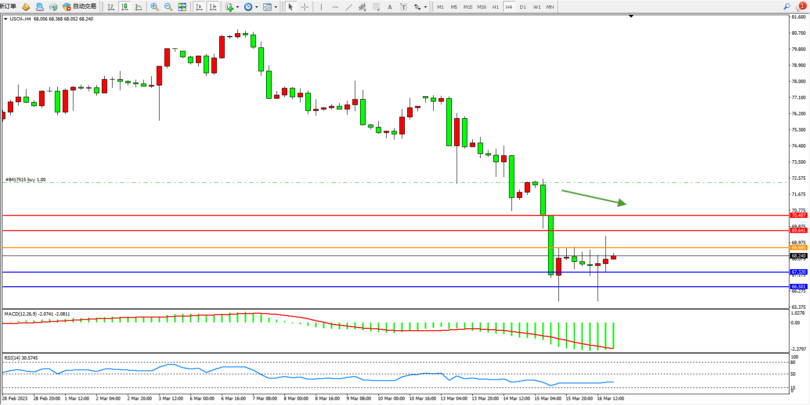 交易策略:68.685下方看跌,目标67.320  66.501