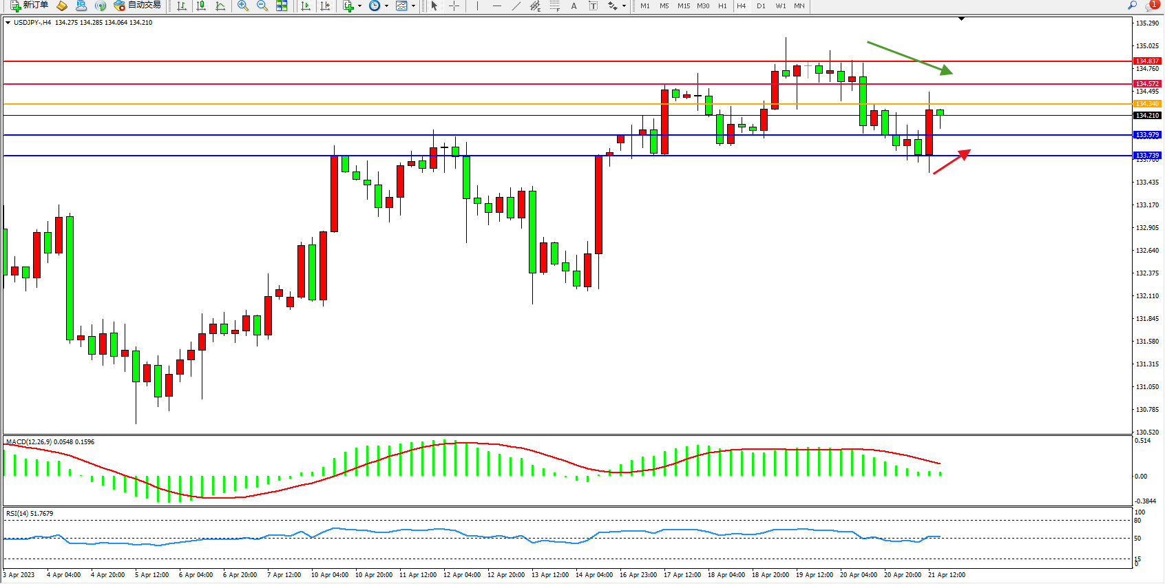 4小时图看:空头动力维持震荡下移后短期快速拉升,市场看空情绪依旧,短期有继续向下移动迹象,MACD指标处于0轴线上側弱势徘徊,RSI指标处于50均衡线附近弱势整理;