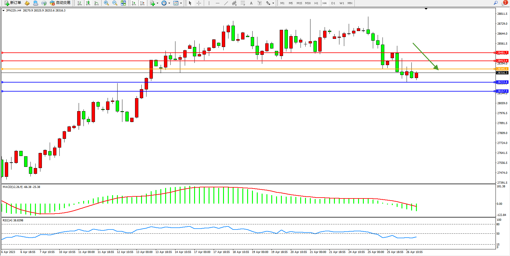 日经225指数4月26日(周三)收盘下跌190.57点,跌幅0.67%,报28429.50点。日本央行行长植田和男:日本的成本驱动型通胀已见顶,在成本驱动型通胀发生期间,货币政策应对困难。政府应致力于可持续融资的工作,这非常重要。目前市场对日本财政失去信任导致通胀上升的风险很低。