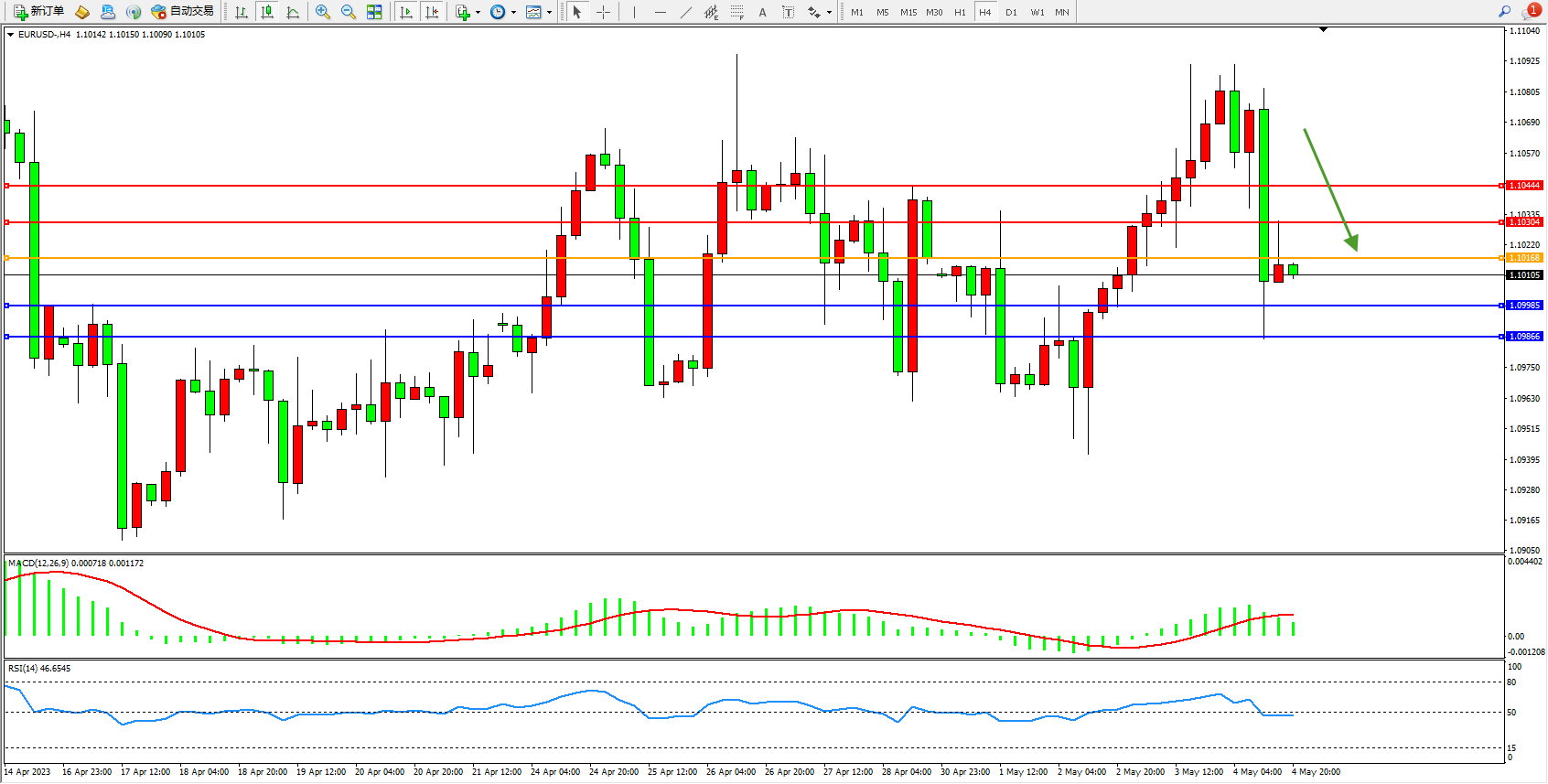 欧元美元EURUSD—4小时K线图显示: