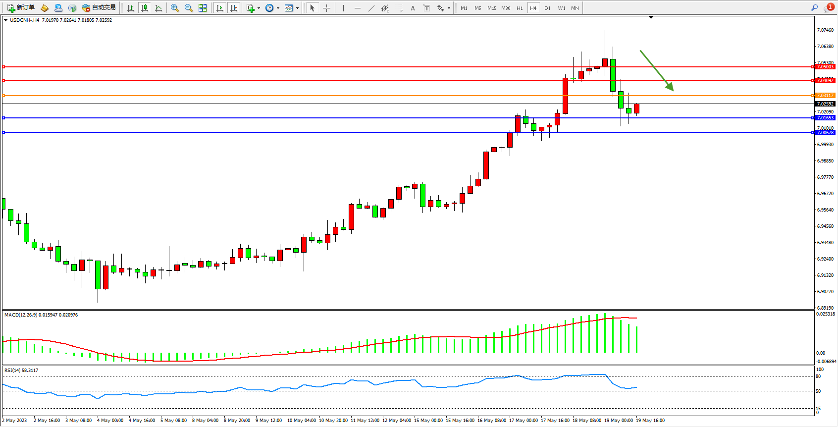 交易策略:7.03117下方看跌,目标7.01653 7.00678