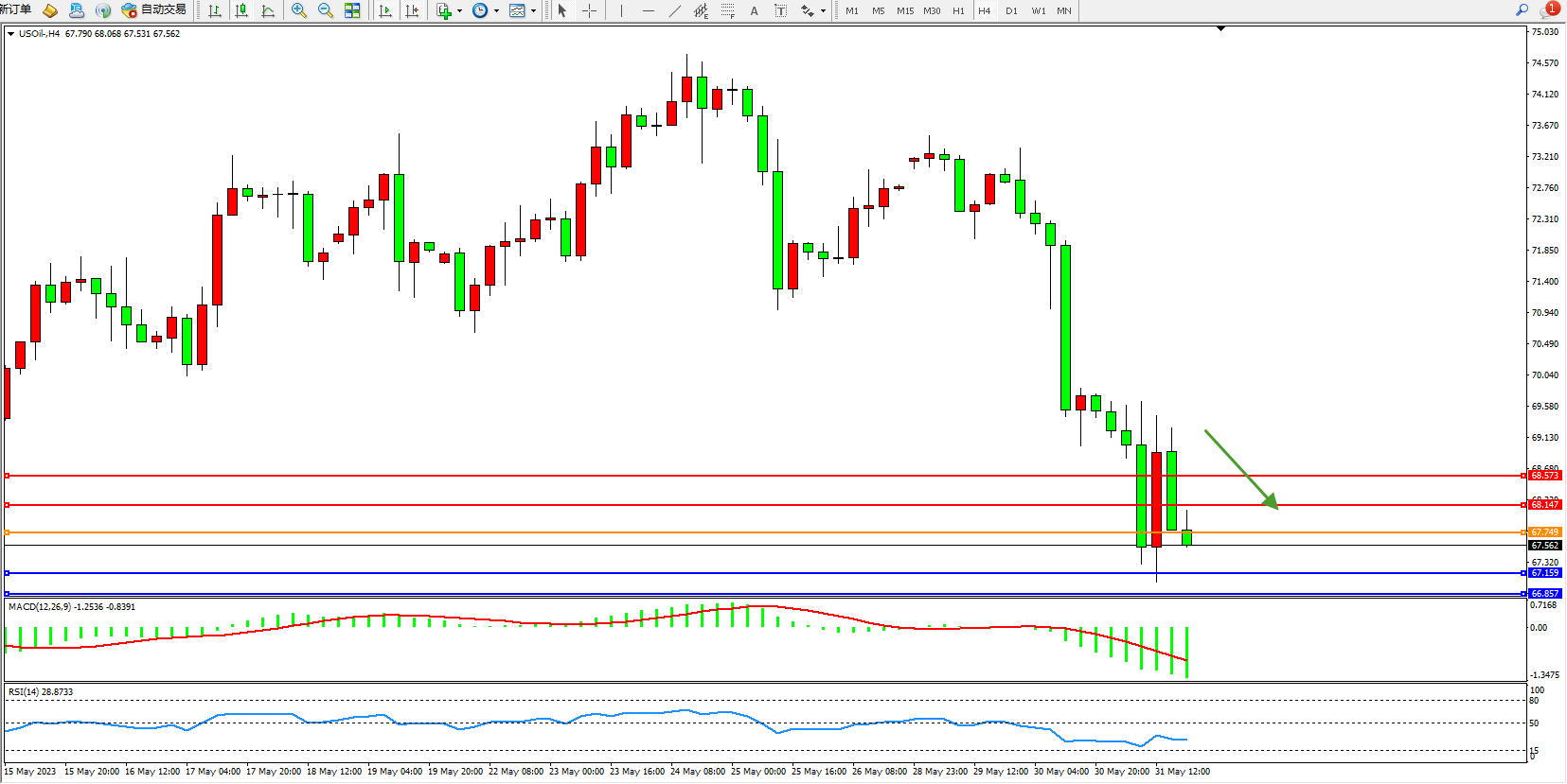 交易策略:67.749下方看跌,目标67.159 68.857