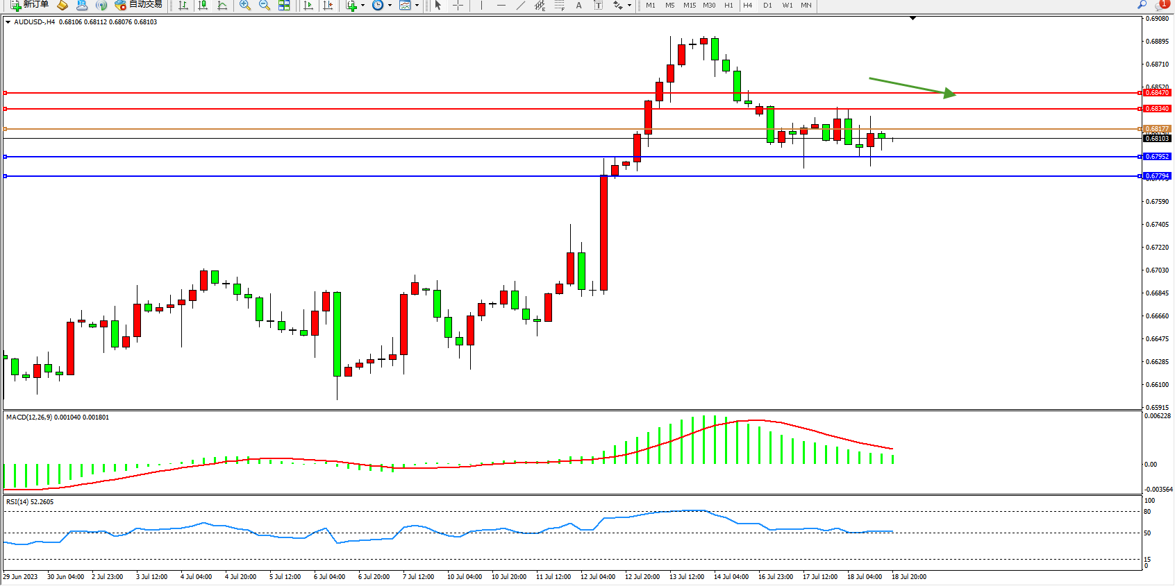 交易策略:0.68177下方看跌,目标0.67952  0.67794