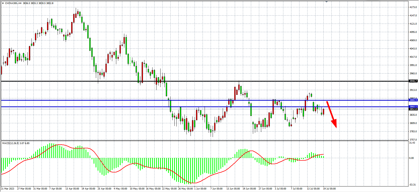 4小时图看,沪深300在3860之下盘整,MACD在零轴上缩量,行情进入窄幅盘整,当前支撑关注3800附近,上方压力3900附近。