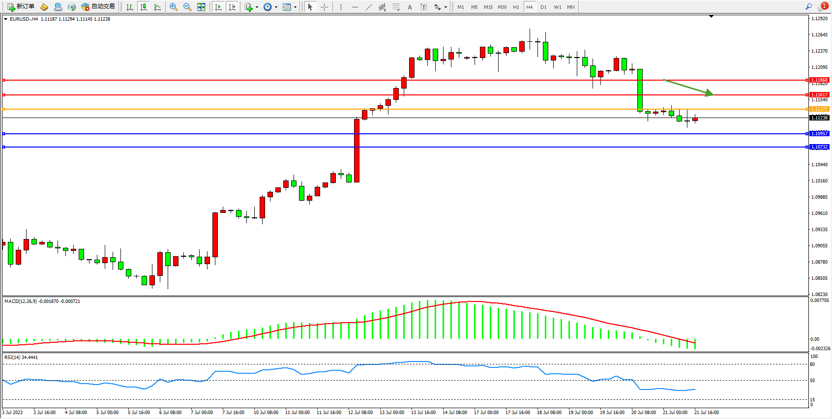 欧元美元EURUSD—4小时K线图显示: