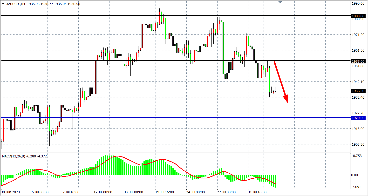 4小时图看,黄金反弹1955附近继续受阻回落,MACD量能在零轴下放量运行,行情走势延续空头,阻力下移1955-1970,下方支撑看1920-1900附近。