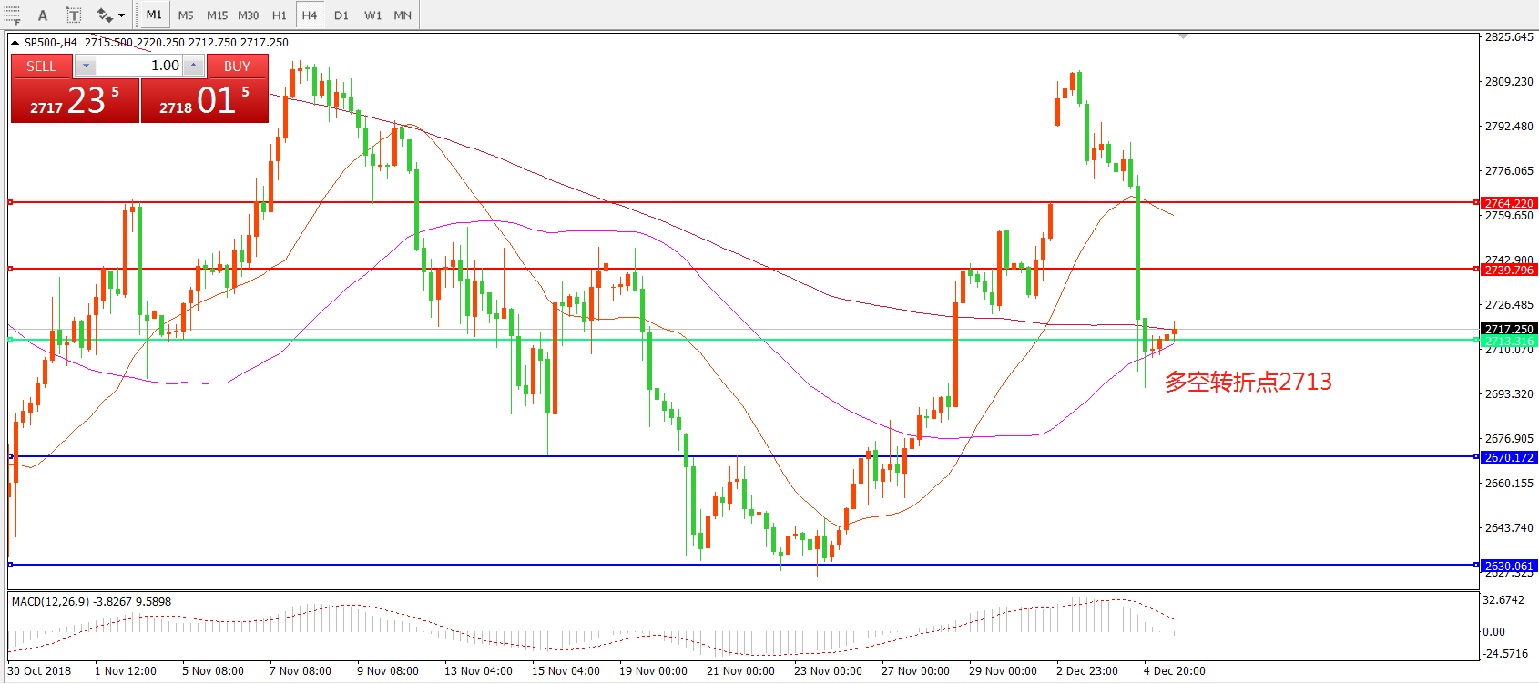 4小时图看,标普500连续下破关键支撑,整体价格直接跌至55周期均线以下,21周期均线稍有拐头迹象,MACD红柱缩短。小幅反弹后有继续回落可能,重点关注多空转折点2713一线
