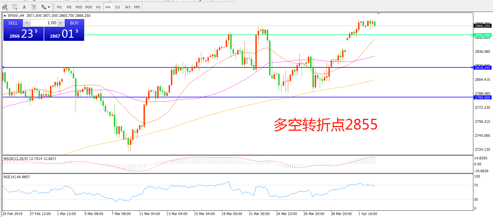 4小时图看,标普500突破2855后以小幅震荡为主,均线系统呈现多头排列, MACD红柱增加,RSI指标走平,日内走势震荡偏多。