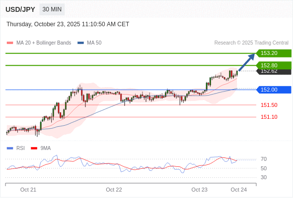 在 151.90 之上,看涨,目标价位为 152.80 ,然后为 153.20 。