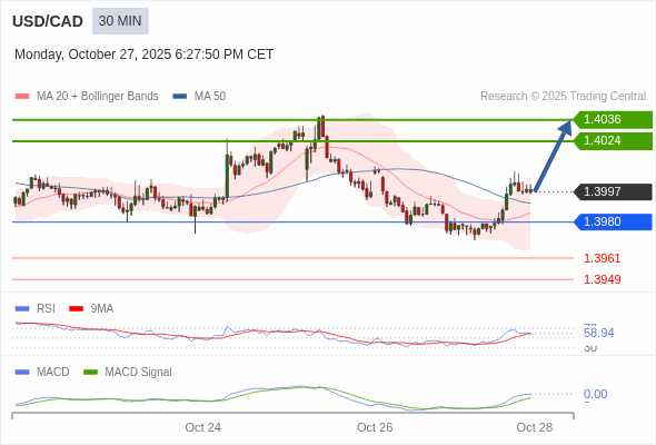 美元/加元 当日内 : 看涨,当 1.3980 为支撑位。