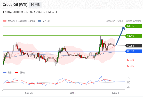 在 60.50 之上,看涨,目标价位为 61.40 ,然后为 61.95 。