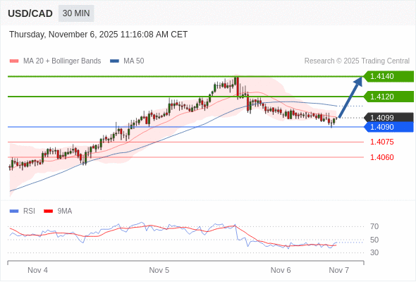 在 1.4090 之上,看涨,目标价位为 1.4120 ,然后为 1.4140 。