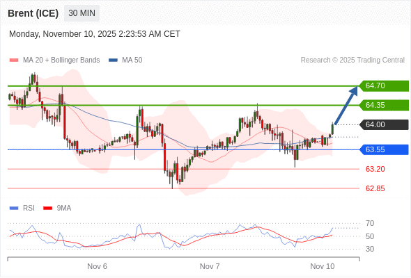 在 63.55 之上,看涨,目标价位为 64.35 ,然后为 64.70 。