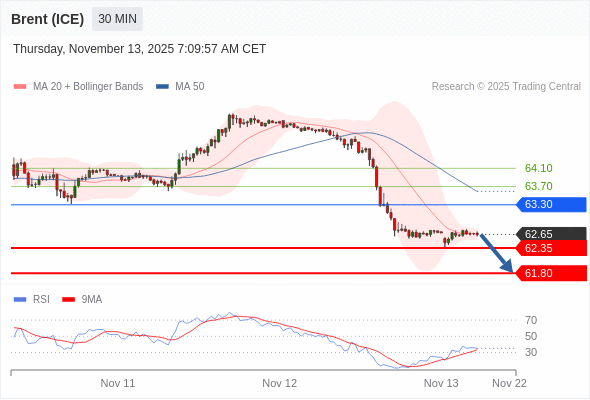 在 63.30 之下,看跌,目标价位为 62.35 ,然后为 61.80 。