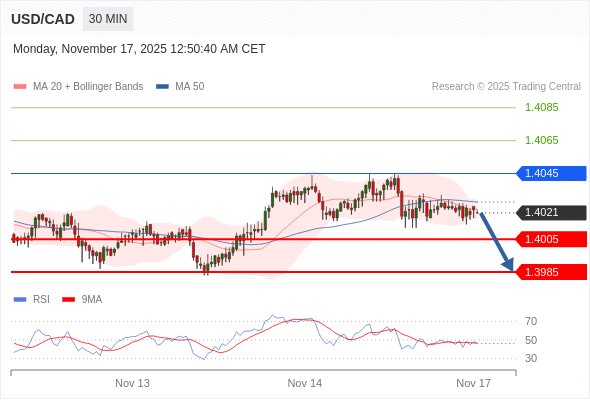 在 1.4045 之下,看跌,目标价位为 1.4005 ,然后为 1.3985 。