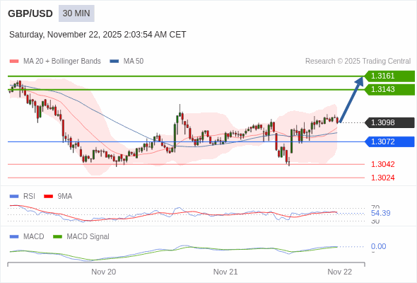 英镑/美元 当日内 : 看涨,当 1.3072 为支撑位。