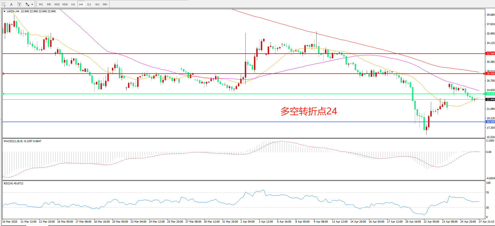 4小时图看,油价震荡下行,整体表现偏弱,55周期均线成为短期阻力,18.5成为下方支撑,MACD红柱缩短,RSI指标走平,日内震荡下行概率较大。