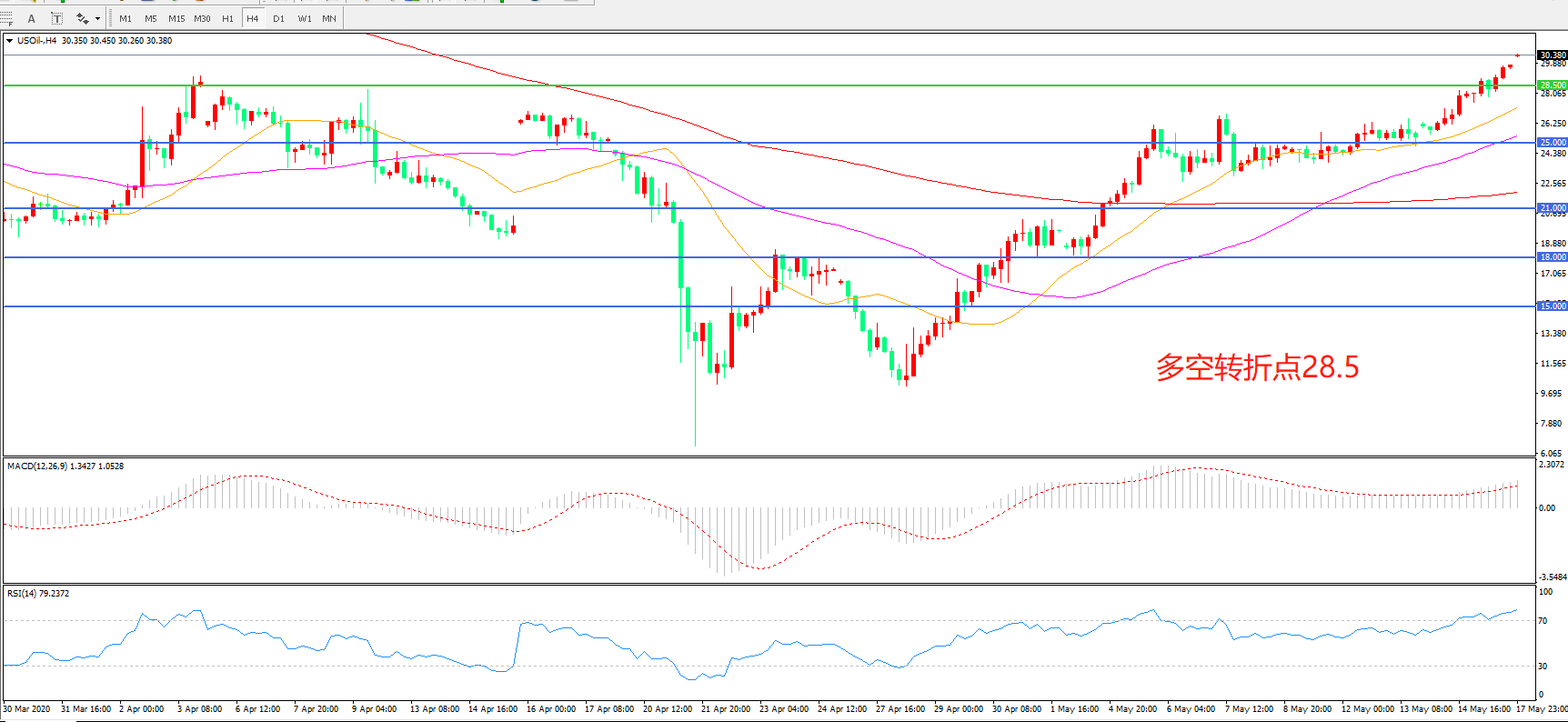 4小时图看,油价震荡走高,突破前期整理区间,整体表现十分强势,均线系统拐头向上,MACD红柱增加,RSI指标走平,日内延续上行概率较大。