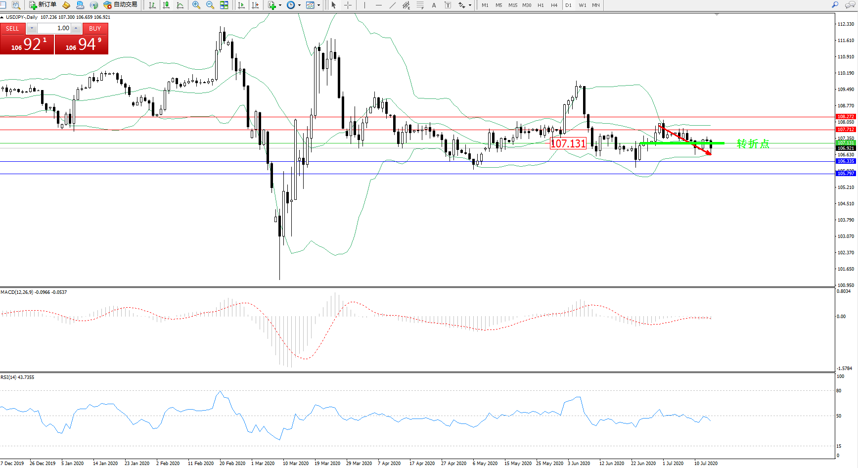 交易策略:107.131下方看跌,目标106.335、105.797
