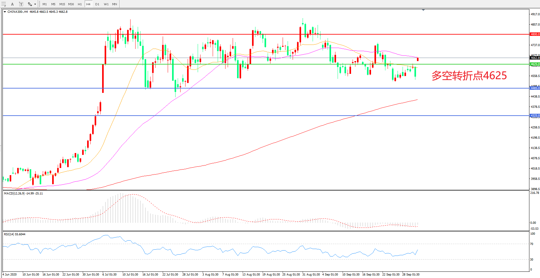 4小时图看,沪深300延续低位震荡,短期方向并不明确,4625成为多空分水岭,均线系统走平, MACD绿柱增加,RSI指标走平,日内延续震荡概率较大。