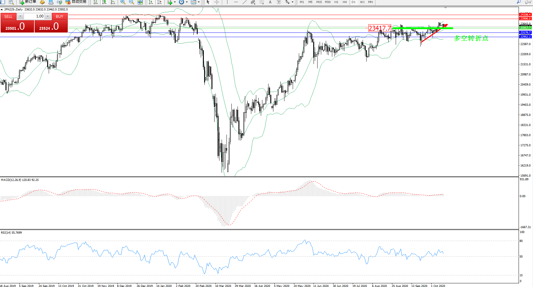 日经225指数10月13日(周二)收盘上涨40.31点,涨幅0.17%,报23599.00点。美元指数略有回升,不过若拜登赢得美国总统大选,且民主党获得参议院多数席位,这样的选举结果会导致美国国债收益率出现膝跳反射式的下跌,日本新任首相菅义伟将于下周迎来其就任后的首次外访,他将首先访问越南和印度尼西亚两国。据日本共同社报道,在13日召开的日本自民党役员会上,笔头副干事长山口壮公布了首相出访消息。他还称,此次外访以“维护亚太地区稳定”为目的,希望加强和东南亚各国的合作。据日经新闻:日本首相菅义伟将指示其政府制定经济刺激计划。将于11月制定更多经济政策。日本政府可能考虑扩大“GO TO TRAVEL”活动,作为经济刺激的一部分。日本能源部长希望增加日本对替代能源的依赖。