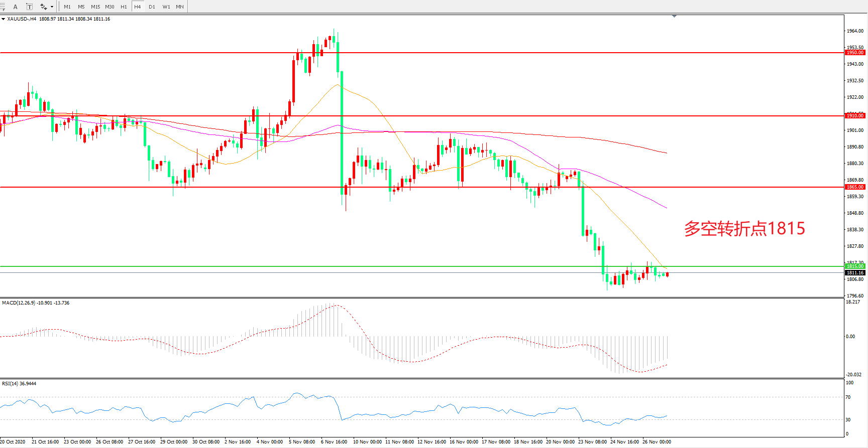4小时图看,金价长阴下破后延续窄幅震荡,短期走势十分低迷,均线系统呈空头排列,1815成为多空分水岭, MACD绿柱减少,RSI指标走平,日内延续震荡概率较大。