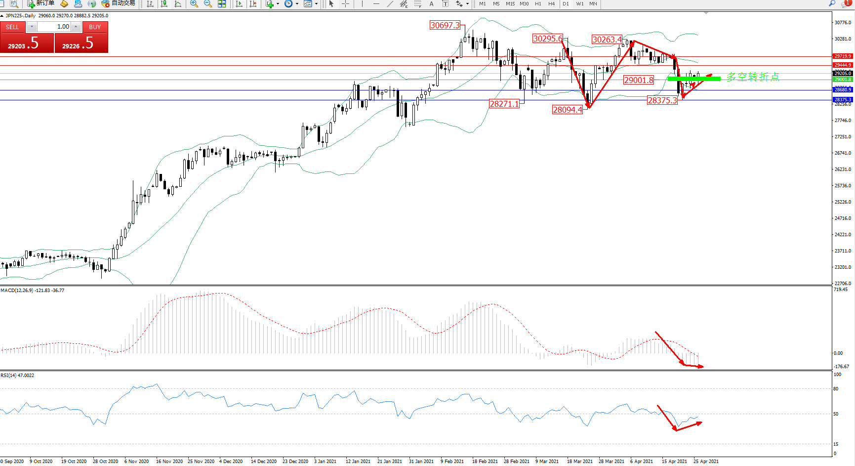 日经225指数4月26日(周一)收盘上涨120.87点,涨幅0.42%,报29141.50点。日本央行料将在周二维持货币刺激政策不变,在日本再度宣布紧急状态令后,该行的经济预期可能成为主要关注点。日央行长黑田东彦及政策委员会将会在为期两天的会议结束后维持当前利率和资产购买政策设置,他们会评估上月政策调整的影响。日本从周日起对东京,大阪和另外两个县宣布进入疫情防控紧急状态,这令央行在季度展望报告中评估经济走向的工作复杂化。在宣布紧急状态令之前,知情人士称,日本央行官员认为美国和中国经济的强劲复苏将会使依赖出口的日本经济得到提振,他们认为有上调经济增长预期的空间。