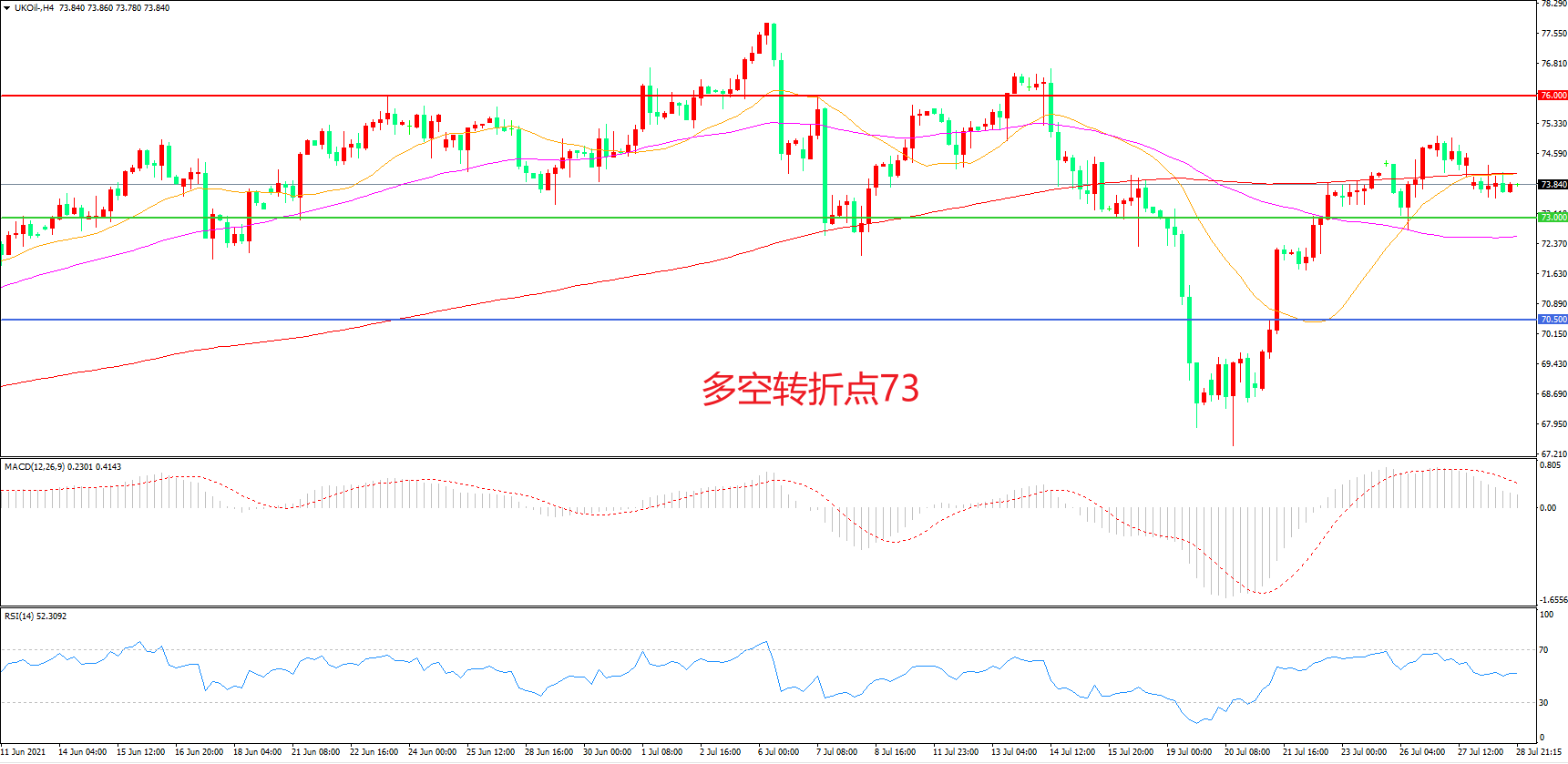 4小时图看,油价长阳拉升后延续高位震荡,200周期均线被顺利突破,73美元成为多空分水岭,均线系统走平,MACD红柱增加,日内震荡上行概率较大。