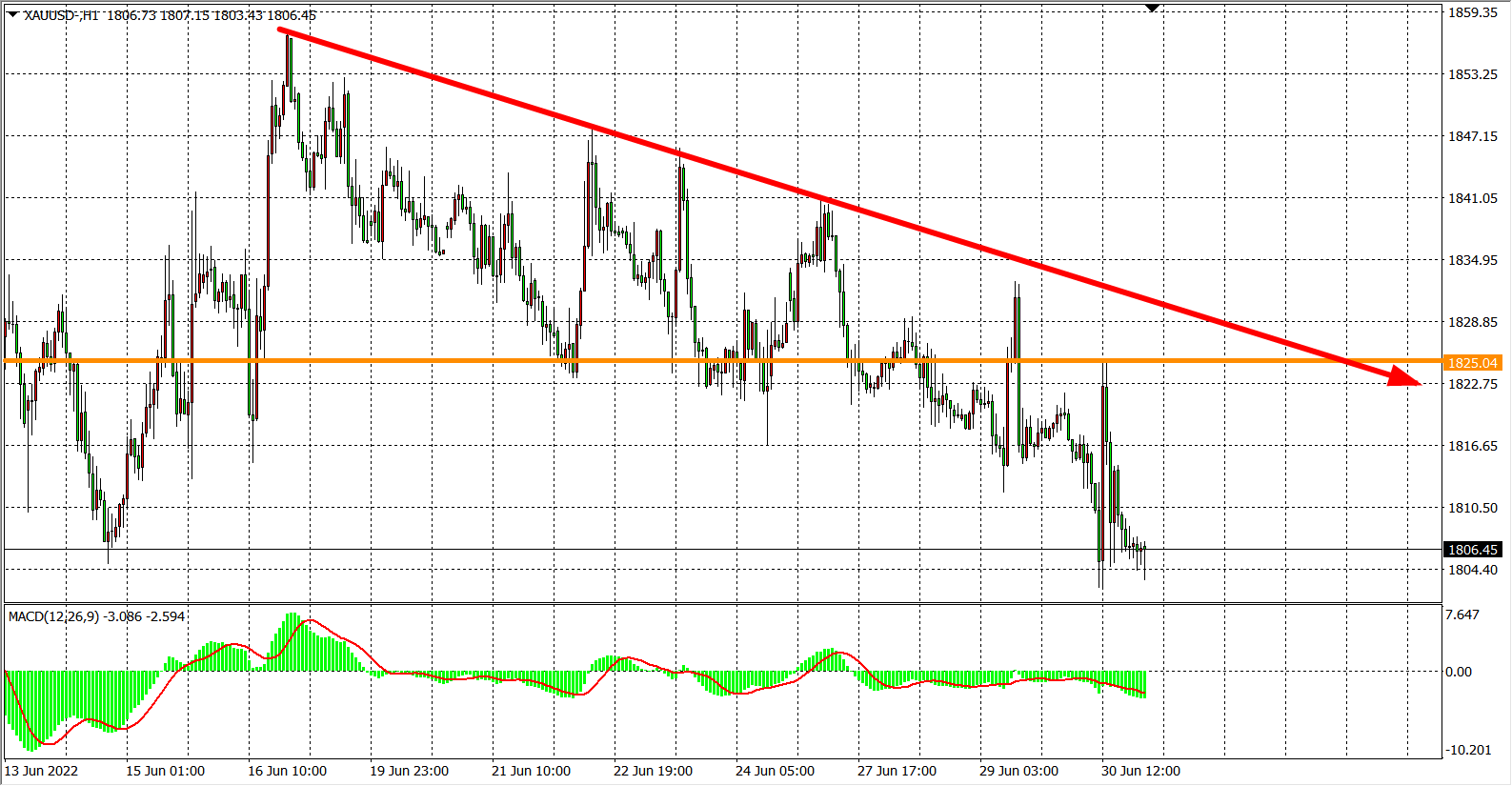 周四(6月30日)美国5月核心PCE物价指数年率录得4.7%,为去年11月以来新低,略低于预期的4.8%,该数据表明通胀开始出现略微见顶回落信号,一定程度上减缓了美国经济衰退的担忧。现货黄金再次上演过山车行情,盘中先涨后跌,振幅超20美元,最终收跌0.54%,报1807.26美元/盎司。