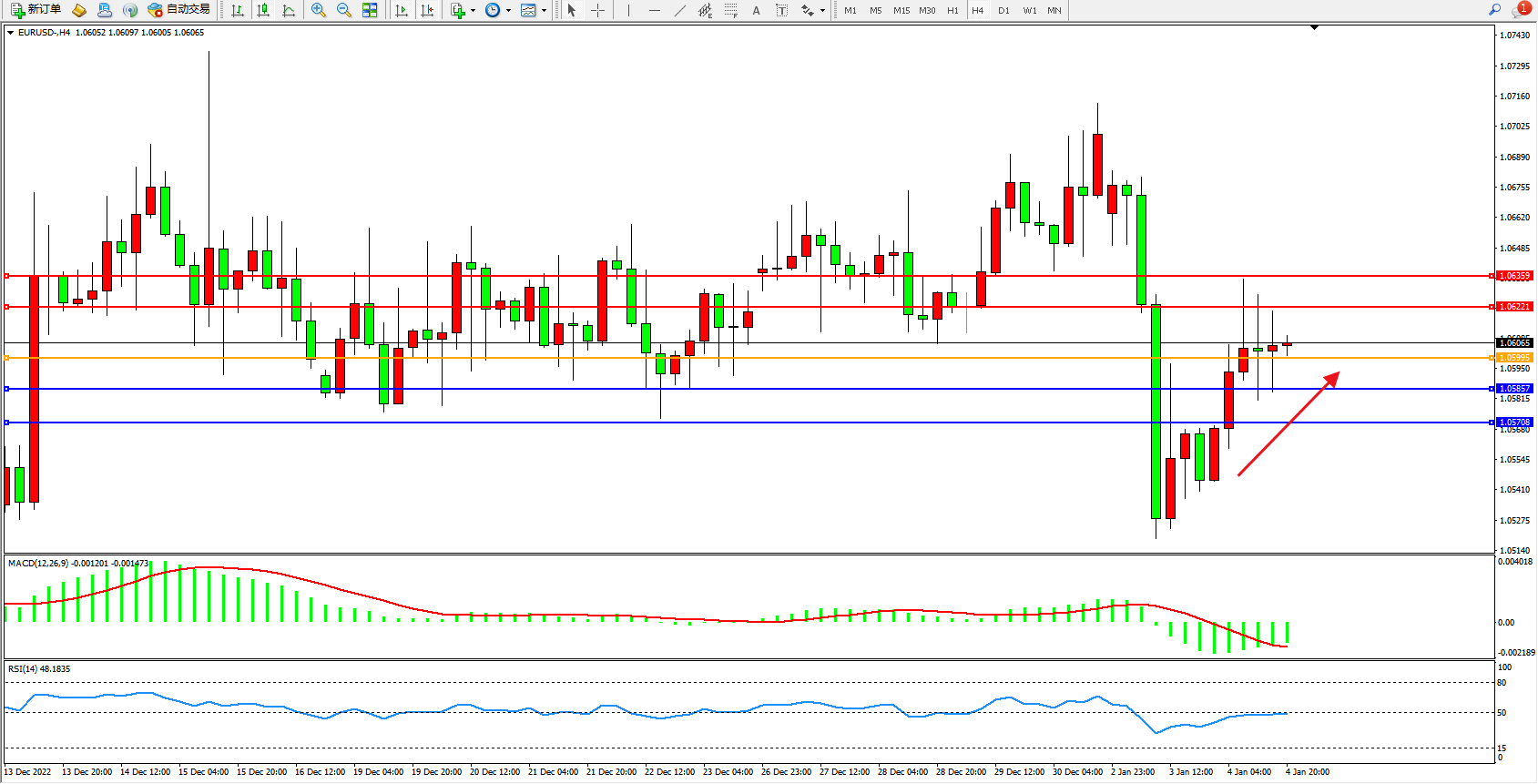 欧元美元EURUSD—4小时K线图显示: